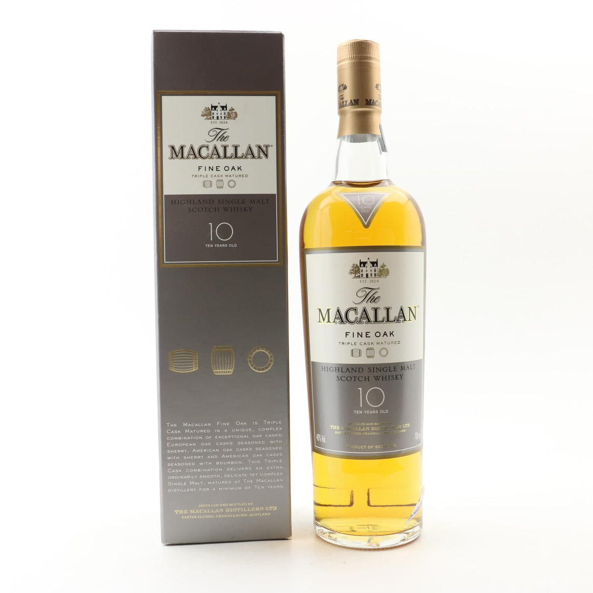 The Macallan triple oak single malt has been matured for 10 years in 3 separate casks including European Oak, Sherry and American Oak. bottled at 40% and non chill filtered with the best cut.