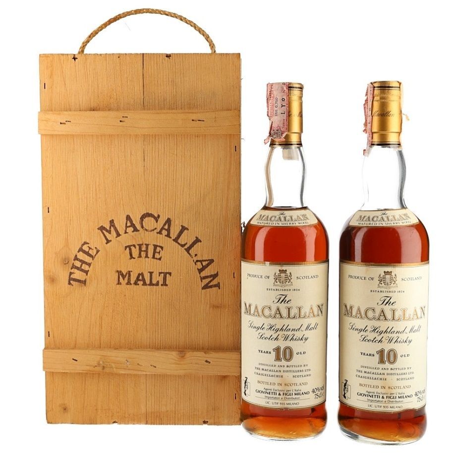 This box contains two bottles of The Macallan 10 Year Old Single Highland Malt Scotch Whisky, matured in sherry wood. These were imported to Italy by Giovinetti, in the early 1980s.