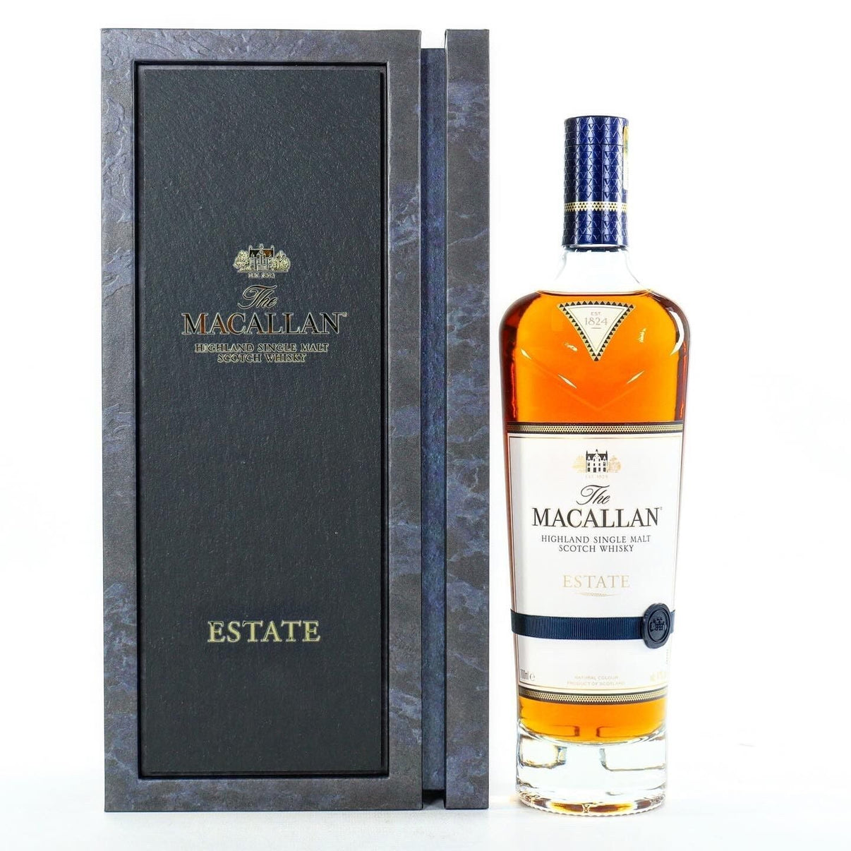 The Macallan Estate delivers a subtle hint of citrus which balances the traditional sherried richness, resulting in a complex single malt with an extraordinarily long finish. Estate offers a unique opportunity to experience rare spirit made from our precious estate-grown barley and honours the birthplace of every bottle of The Macallan.