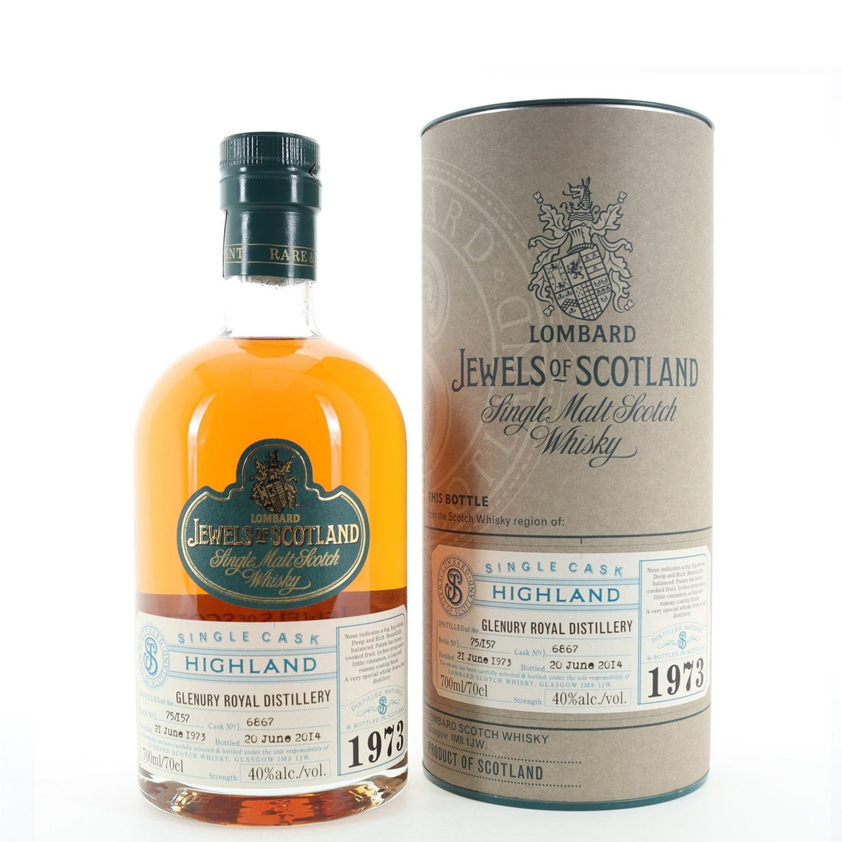Glenury Royal 40 Year Old 1973 Lombard Jewels of Scotland Single Cask #6867 Highland Single Malt Scotch Whisky (2014) 70cl1 of 157 bottles produced. This is bottle number 75Distilled: 21/06/1973,...