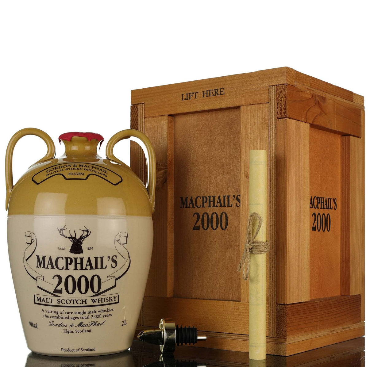A special 2-litre decanter from Gordon & Macphail of their mystery malt whisky Macphail's. This stoneware decanter was released for the millennium in 2000. The combined ages of the whiskies in this blend total 2000 years.