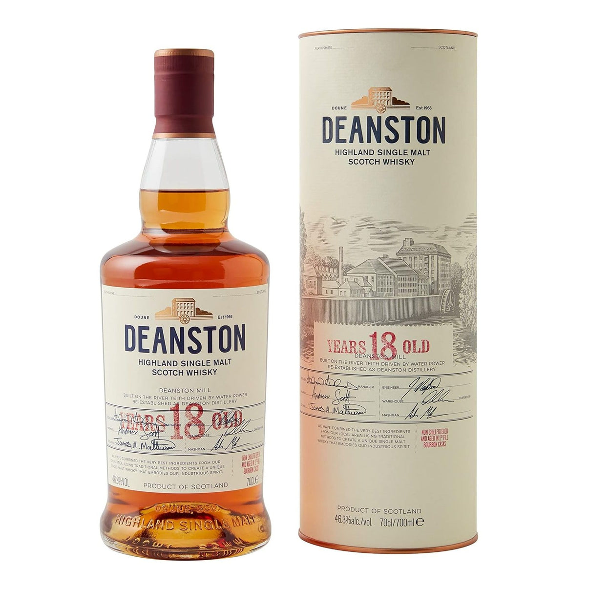 Deanston 18 Year Old, an award-winning single malt Scotch Whisky from the Scottish Highlands. Packed with character, It has the Deanston waxiness but has lots of citrus and really pleasant and long lasting finish, as well as subtle spiciness and bit of sweetnessFirst matured for 16 years in traditional American oak casks that have previously held some of the finest bourbon. This allows the phenomenal Deanston new make to flourish and shine. It is then finished for 2 years in first fill ex-bourbon casks to create a fantastic flavour which is well rounded and balanced. Some would say, at least our Head of Distilleries would say, it reminds them of Orange Marmalade with lots of rind mixed through. Non-chill filtered and natural in colour, for a truly authentic character, colour and taste. A damn fine dram if we say so ourselves.