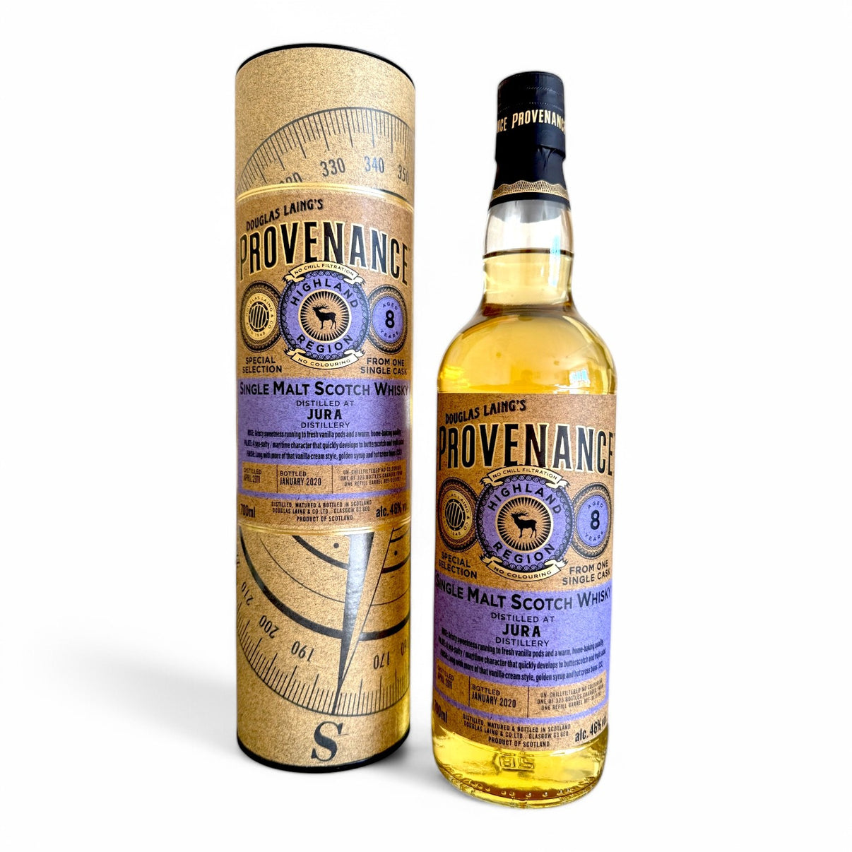 Since 1993, it has been owned by Whyte & Mackay and produces over 2 million litres of distillate annually. The Jura presented here, distilled in April 2011, spent over eight years in a refilled bourbon cask (DL 13792), and was bottled in January 2020 at 46% abv by Douglas Laing & Co in the Provenance series, in an edition of 323 bottles. Whiskies from the Douglas Laing & Co. offer are bottled with natural colour and without chill filtration. In 2020, Jura was the most popular single malt